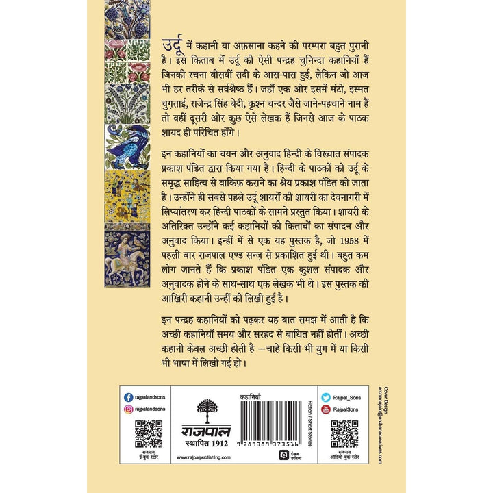 उर्दू में कहानी या अफ़साना कहने की परम्परा बहुत पुरानी है। इस किताब में उर्दू की ऐसी पन्द्रह चुनिन्दा कहानियाँ हैं जिनकी रचना बीसवीं सदी के आसपास हुई, लेकिन जो आज भी हर तरीके से सर्वश्रेष्ठ हैं। जहाँ एक ओर इसमें मंटो, इस्मत चुगताई, राजेन्द्रसिंह बेदी, कृश्नचन्दर जैसे जाने-पहचाने नाम हैं तो वहीं दूसरी ओर कुछ ऐसे लेखक हैं जिनसे आज के पाठक शायद ही परिचित होंगे। इन कहानियों का चयन और अनुवाद हिन्दी के विख्यात सम्पादक प्रकाश पंडित द्वारा किया गया है। हिन्दी के पाठकों को उर्दू के समृद्ध साहित्य से वाकिफ़ कराने का श्रेय प्रकाश पंडित को जाता है। उन्होंने ही सबसे पहले उर्दू शायरों की शायरी का देवनागरी में लिप्यांतरण कर हिन्दी पाठकों के सामने प्रस्तुत किया। शायरी के अतिरिक्त उन्होंने कई कहानियों की किताबों का सम्पादन और अनुवाद किया। इन्हीं में से एक यह पुस्तक है, जो 1958 में पहली बार राजपाल एण्ड सन्ज़ से प्रकाशित हुई थी। बहुत कम लोग जानते हैं कि प्रकाश पंडित एक कुशल सम्पादक और अनुवादक होने के साथ-साथ एक लेखक भी थे। इस पुस्तक की आखिरी कहानी उन्हीं की लिखी हुई है। इन पन्द्रह कहानियों को पढ़कर यह बात समझ में आती है कि अच्छी कहानियाँ समय और सरहद से बाधित नहीं होतीं। अच्छी कहानी केवल अच्छी होती हैं - चाहे किसी भी युग में या किसी भी भाषा में लिखी गई हो।