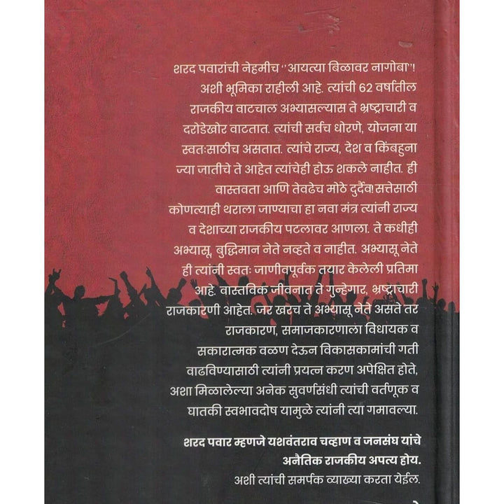 शरद पवारांची नेहमीच "आयत्या बिळावर नागोबा"! अशी भूमिका राहीली आहे. त्यांची 62 वर्षातील राजकीय वाटचाल अभ्यासल्यास ते भ्रष्ट्राचारी व.. दरोडेखोर वाटतात. त्यांची सर्वच धोरणे, योजना या स्वतःसाठीच असतात. त्यांचे राज्य, देश व किंबहुना .. ज्या जातीचे ते आहेत त्यांचेही होऊ शकले नाहीत. ही., वास्तव्रता आणि तेवढेच मोठे दुर्दैव सत्तेसाठी कोणत्याही थराला जाण्याचा हा नवा मंत्र त्यांनी राज्य व देशाच्या राजकीय पटलावर आणला. ते कधीही अभ्यासू, बुद्धिमान नेते नव्हते व नाहीत. अभ्यासू नेते ही त्यांनी स्वतः जाणीवपूर्वक तयार केलेली प्रतिमा आहे. वास्तविक जीवनात ते गुन्हेगार, भ्रष्ट्राचारी राजकारणी आहेत. जर खरच ते अभ्यासू नेते असते वर राजकारण, समाजकारणाला विधायक व सकारात्मक वळण देऊन विकासकामांची गती वाढविण्यासाठी त्यांनी प्रयत्न करण अपेक्षित होते, अशा मिळालेल्या अनेक सुवर्णसंधी त्यांची वर्तणूक व घातकी स्वभावदोष यामुळे त्यांनी त्या गमावल्या. शरद पवार म्हणजे यशवंतराव चव्हाण व जनसंघ यांचे अनैतिक राजकीय अपत्य होय. अशी त्यांची समर्पक व्याख्या करता येईल.