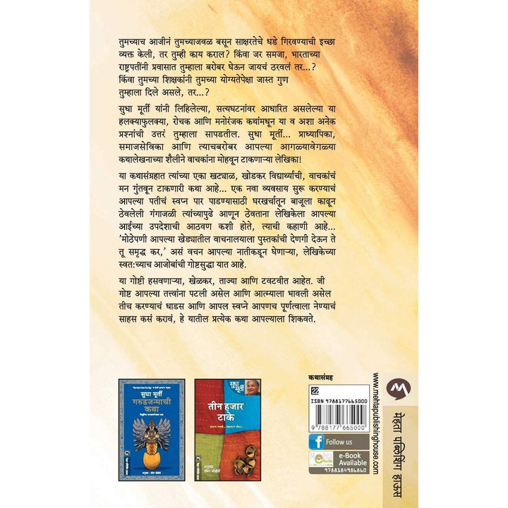 Author: Sudha Murty | Publisher: Mehta Publishing House | Language: Marathi | Binding: Paperback | No of Pages: 166