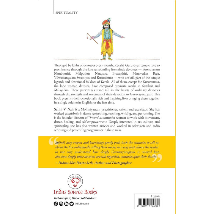 Thronged by lakhs of devotees every month, Kerala's Guruvayur temple rose to prominence through the lore surrounding five saintly devotees - Poonthanam Nambootiri, Melputhur Narayana Bhattathiri, Manavedan Raja, Vilwamangalam Swamiyar, and Kururamma - who are still part of the temple legends and devotional folklore of Kerala. All of them, except for Kururamma, the lone woman devotee, have composed exquisite works in Sanskrit and Malayalam. These personages stand tall in the hearts of ordinary devotees through the strength and sweetness of their devotion to Guruvayurappan. This book presents their devotionally rich and inspiring lives bringing them together in a single volume in English for the first time.