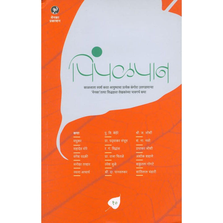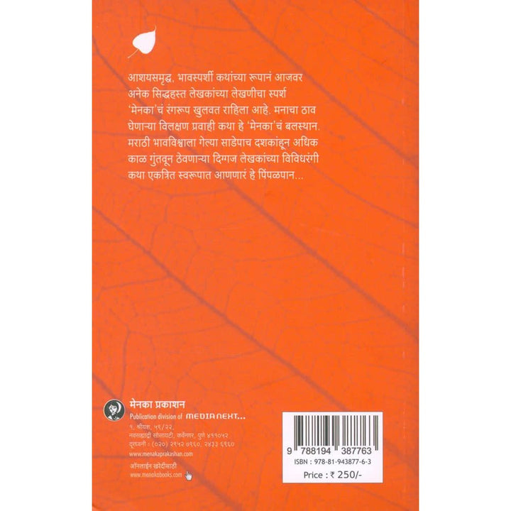 आशयसमृध्द, भावस्पर्शी कथांच्या रुपानं आजवर अनेक सिध्दहस्त लेखकांच्या लेखणीचा स्पर्श ’मेनका’चं रंगरुप खुलवत राहिला आहे. मनाचा ठाव घेणा-या विलक्षण प्रवाही कथा हे ’मेनका’चं बलस्थान. मराठी भावविश्वाला गेल्या साडेपाच दशकांहून अधिक काळ गुंतवून ठेवणा-या दिग्गज लेखकांच्या विविधरंगी कथा एकत्रित स्वरुपात आणणारं हे पिंपळपान....