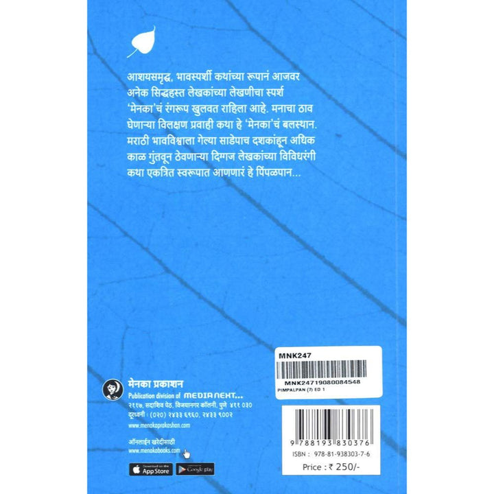 आशयसमृद्घ, भावस्पर्शी कथांच्या रूपानं आजवर अनेक सिद्धहस्त लेखकांच्या लेखणीचा स्पर्श ‘मेनका’चं रंगरूप खुलवत राहिला आहे. मनाचा ठाव घेणार्या विलक्षण प्रवाही कथा हे ‘मेनका’चं बलस्थान. मराठी भावविश्वाला गेल्या साडेपाच दशकांहून अधिक काळ गुंतवून ठेवणार्या दिग्गज लेखकांच्या विविधरंगी कथा एकत्रित स्वरूपात आणणारं हे पिंपळपान..