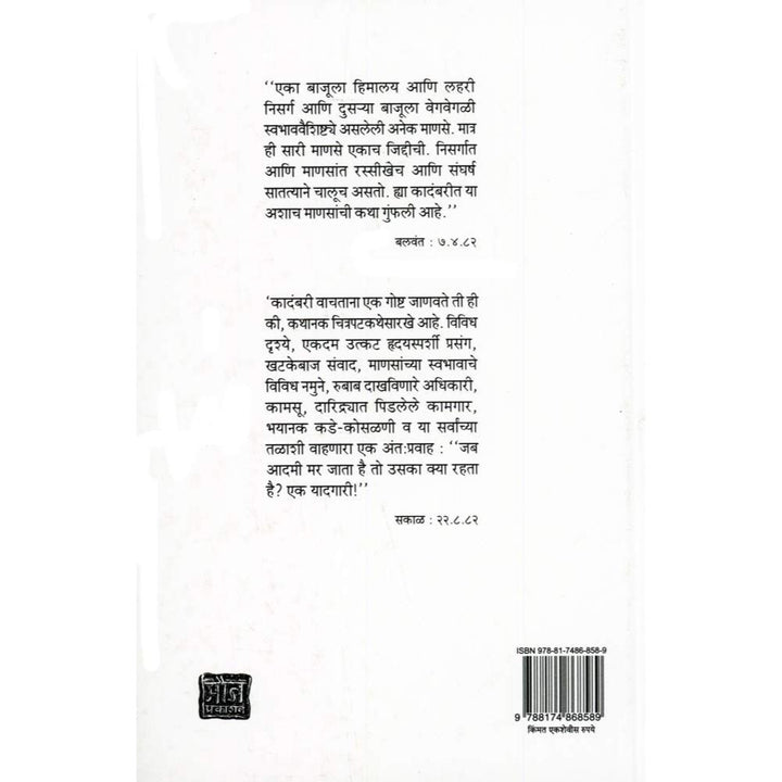 "एका बाजूला हिमालय आणि लहरी निसर्ग आणि दुस-या बाजूला वेगवेगळी स्वभाववैशिष्टये असलेली अनेक माणसे. मात्र ही सारी माणसे एकाच जिद्दीची. निसर्गात आणि माणसांत रस्सीखेच आणि संघर्ष सातत्याने चालूच असतो. हया कादंबरीत या अशाच माणसांची कथा गुंफली आहे." ’कादंबरी वाचताना एक गोष्ट जाणवते ती ही की, कथानक चित्रपटकथेसारखे आहे. विविध दॄश्ये, एकदम उत्कटं हदयस्पर्शी प्रसंग, खटकेबाज संवाद, माणसांच्या स्वभावाचे विविध नमुने, रुबाब दाखविणारे अधिकारी, कामसू, दारिद्रयात पिडलेले कामगार, भयानक कडे-कोसळणी व या सर्वांच्या तळाशी वाहणारा एक अंत:प्रवाह: "जब आदमी मर जाता है तो उसका क्या रहता है? एक यादगारी!"