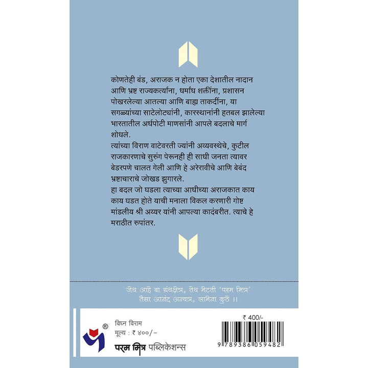 ८ नोव्हेंबर, २०१६ रोजी रात्री ८ वाजता भारताचे पंतप्रधान श्री नरेंद्र मोदी यांनी नोटाबंदी जाहीर केली. हा निर्णय त्यांनी अचानक घेतला होता का की त्यामागे काही कारणे होती श्री अय्यर लिखित Who Painted My Money White या कादंबरीत या सर्व गोष्टींचा उलगडा केला आहे. त्याचेच "विघ्न विराम" हे मराठीतील रूपांतर. Truth is stranger than fiction असे जे म्हणतात ,त्याचा चाणाक्ष वाचकांना प्रत्यय येईल . या शतकातील पहिली दोन दशके अनेक वर्ष हा देश आठवत राहील अशी आहेत. जगात ही ९/११ घडले तशी ही कहाणी,म्हणजे गोष्ट ,भारतातील एका सत्तेचा पट सामान्य चेहरा नसलेल्या माणसांनी उधळून लावल्याची . कोणतेही बंड, अराजक न होता एका देशातील नादान आणि भ्रष्ट राज्यकर्त्यांना, धर्मांध शक्तींना , प्रशासन पोखरलेल्या आतल्या आणि बाह्य ताकदींना ,या सगळ्यांच्या साटेलोट्यांनी ,कारस्थानांनी हतबल झालेल्या ,भारतातील अर्धपोटी माणसांनी आपले बदलाचे मार्ग शोधले. त्यांच्या विराण वाटेवरती ज्यांनी अव्यवस्थेचे ,कुटील राजकारणाचे सुरुंग पेरूनही, ही साधी जनता त्यावर बेडर पणे चालत गेली.तीने हे अरेरावीचे आणि बेबंद भ्रष्टाचाराचे जोखड झुगारले. हा बदल जो घडला, त्याच्या आधीच्या अराजकात काय काय घडत होते याची मनाला विकल करणारी गोष्ट मांडलीय श्री अय्यर यांनी त्याचा अनुवाद